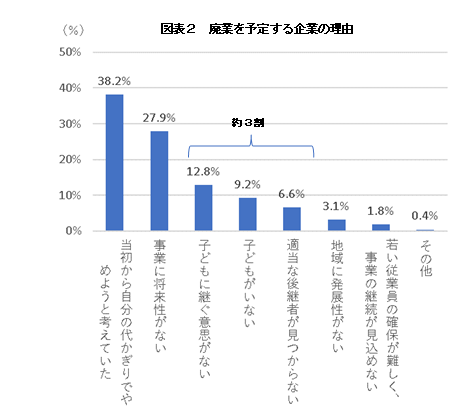 日本政策金融公庫総合研究所の2016年の調査によれば、調査対象企業約4000社のうち60歳以上の経営者の約半数が廃業を予定しているとされ、その約3割は後継者がいないことが理由になっています(図表2参照)。