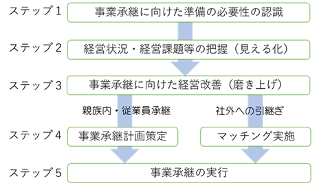 すなわち、まずは現経営者が事業承継に向けた準備の必要性・重要性をしっかりと認識した上で(ステップ1)、後継者が跡を継ぎたくなるような会社に引き上げるべく、経営状況や経営課題等を把握し(ステップ2)、これを踏まえて事業承継に向けた経営改善に取り組んで(ステップ3)、事業承継に向けて中小企業の足腰を固める必要があります。その後、親族又は役員・従業員を後継者とする場合には、事業計画や資産の移転計画を含む事業承継計画を策定しますし、他方、社外への引継ぎを行う場合には、引継ぎ先を選定するためのマッチングを実施し、合意に至ればM&A等を実行することとなり(ステップ4)、晴れて事業承継の完了に至ることになります(ステップ5)が、これらの取り組みには相当の時間がかかります。